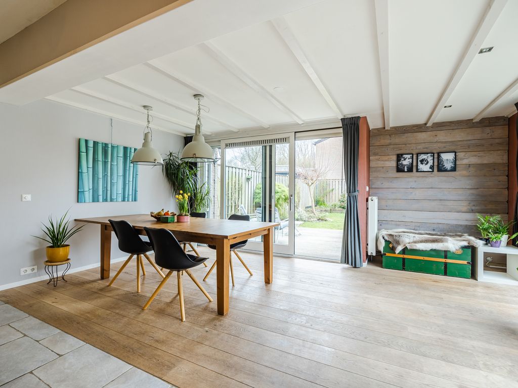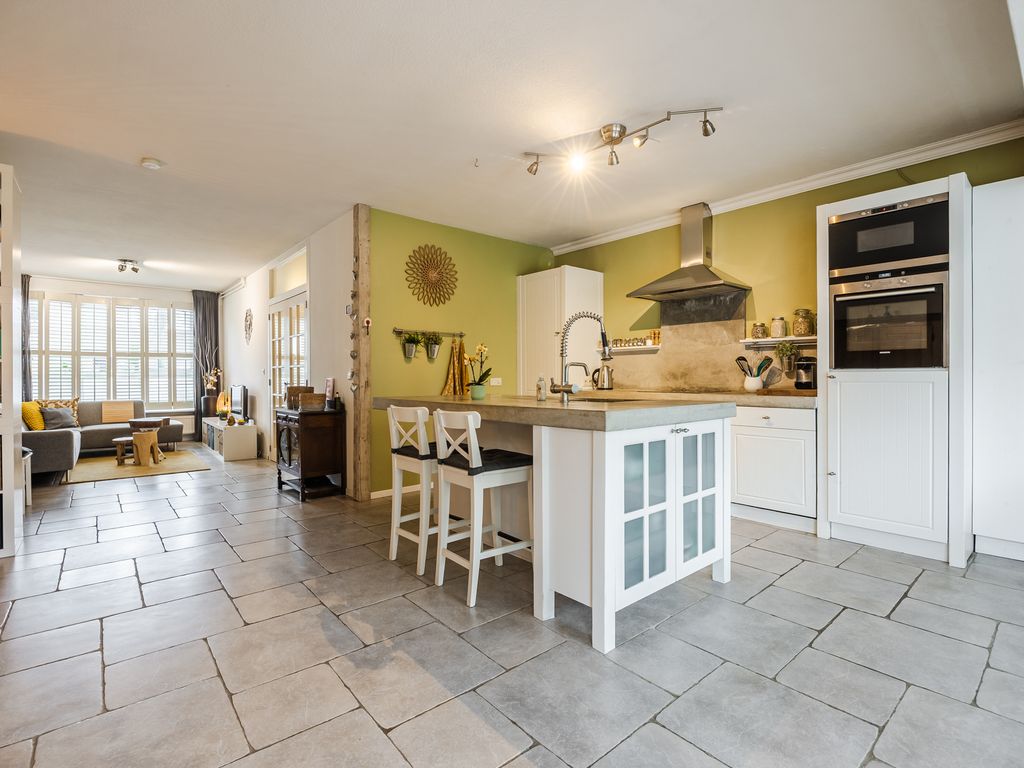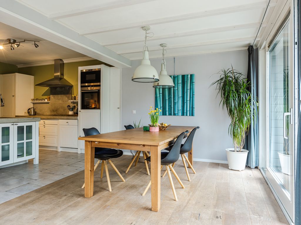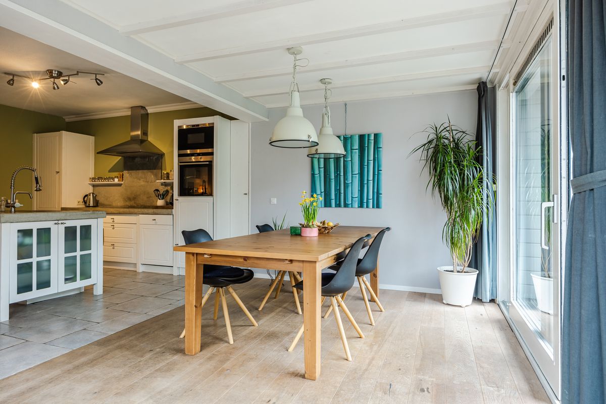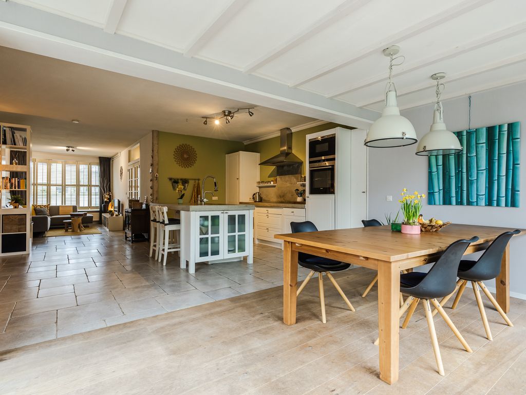 Aan de voorzijde bevindt zich het zitgedeelte, terwijl de keuken centraal in de ruimte is geplaatst en is uitgevoerd met een kookeiland. In de uitbouw is een royale eetkamer gesitueerd, die via twee schuifpuien in directe verbinding staat met de achtertuin.
