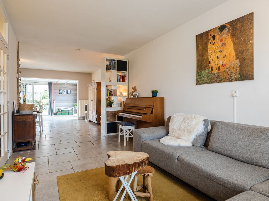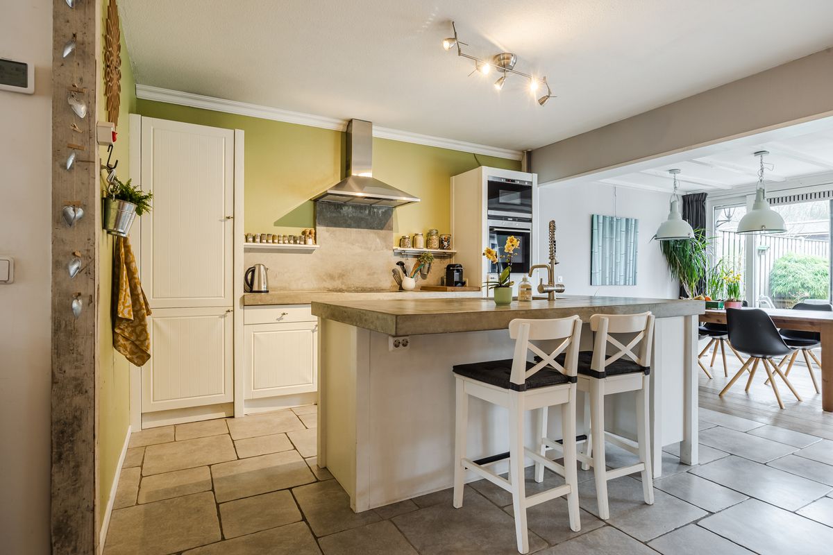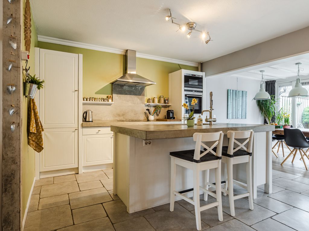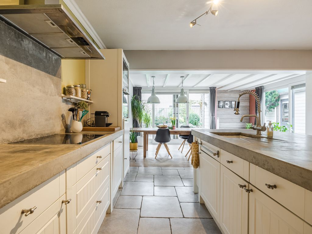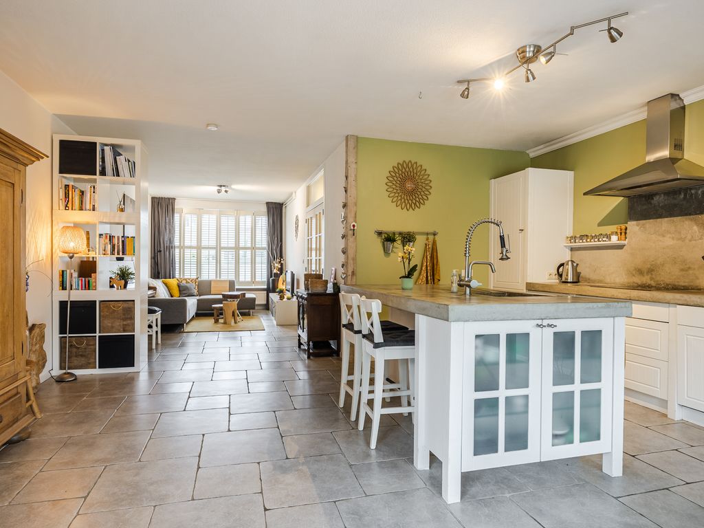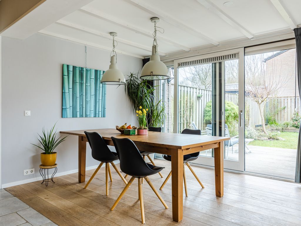 Aan de voorzijde bevindt zich het zitgedeelte, terwijl de keuken centraal in de ruimte is geplaatst en is uitgevoerd met een kookeiland. In de uitbouw is een royale eetkamer gesitueerd, die via twee schuifpuien in directe verbinding staat met de achtertuin.