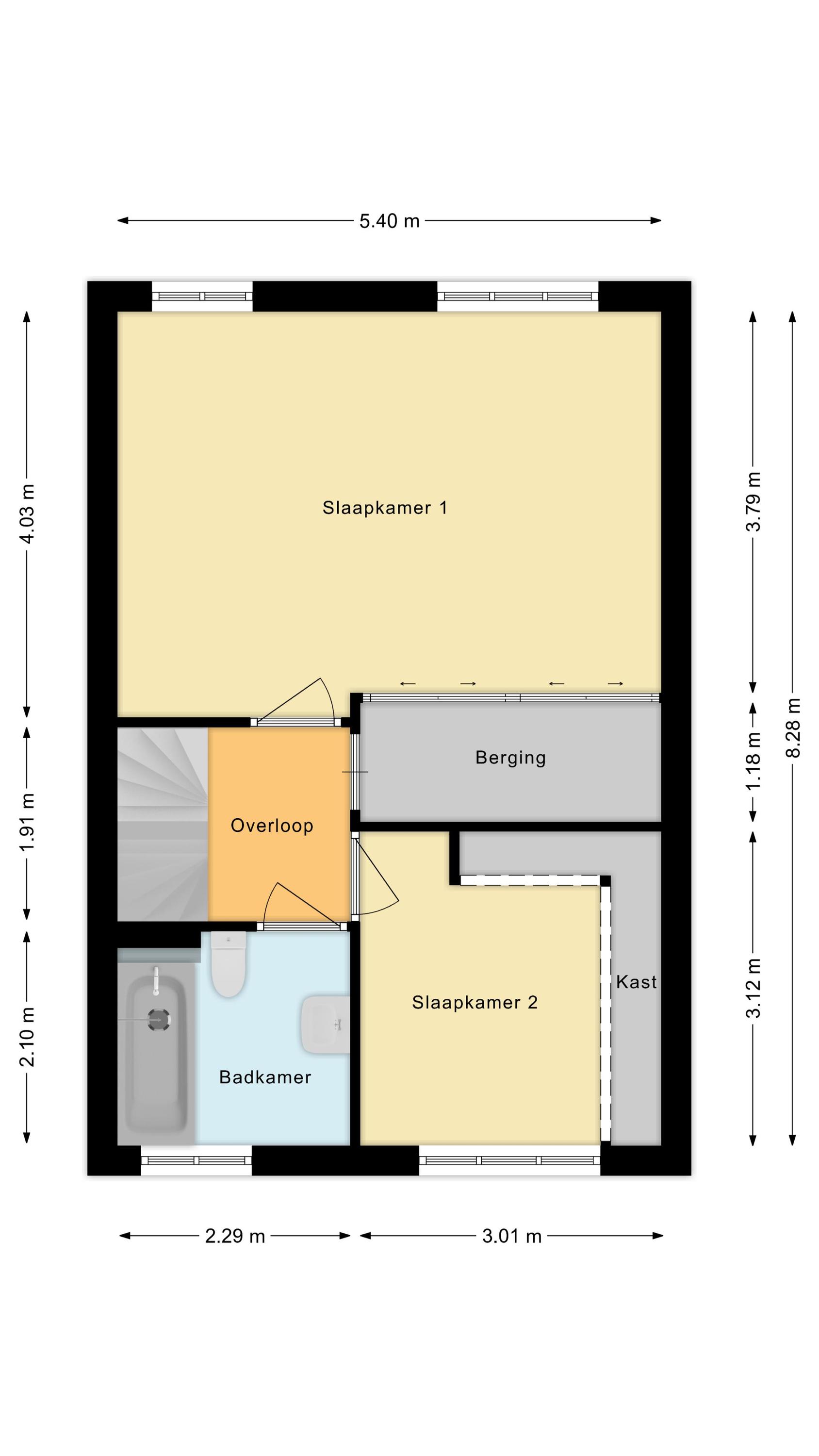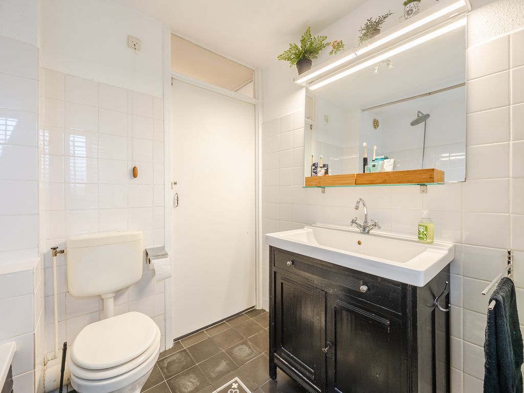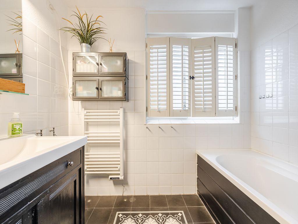 Overloop met vaste trap naar de tweede verdieping. Twee slaapkamers, waarvan de achter slaapkamer is samengevoegd tot één royale kamer (voorheen twee slaapkamers, eenvoudig weer te splitsen). Badkamer met ligbad, tweede toilet en wastafelmeubel.