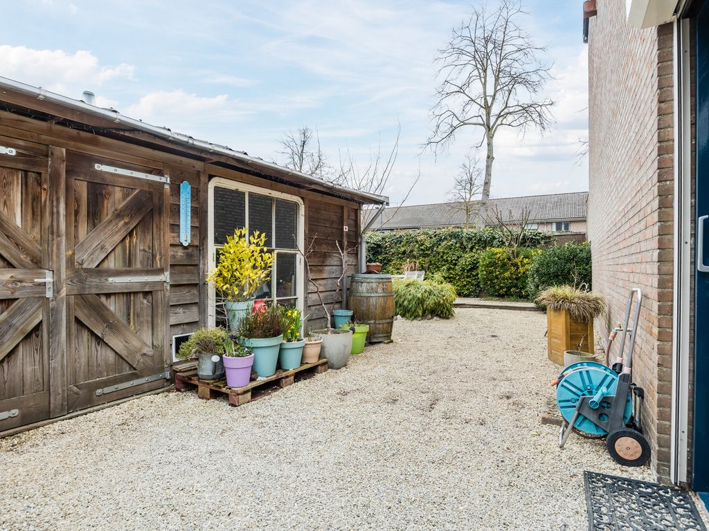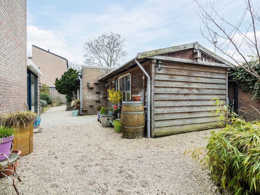 Achterin de tuin bevindt zich een ruime houten schuur/berging, met volop plaats voor meerdere fietsen en tuinbenodigdheden. Praktisch én netjes weggewerkt.