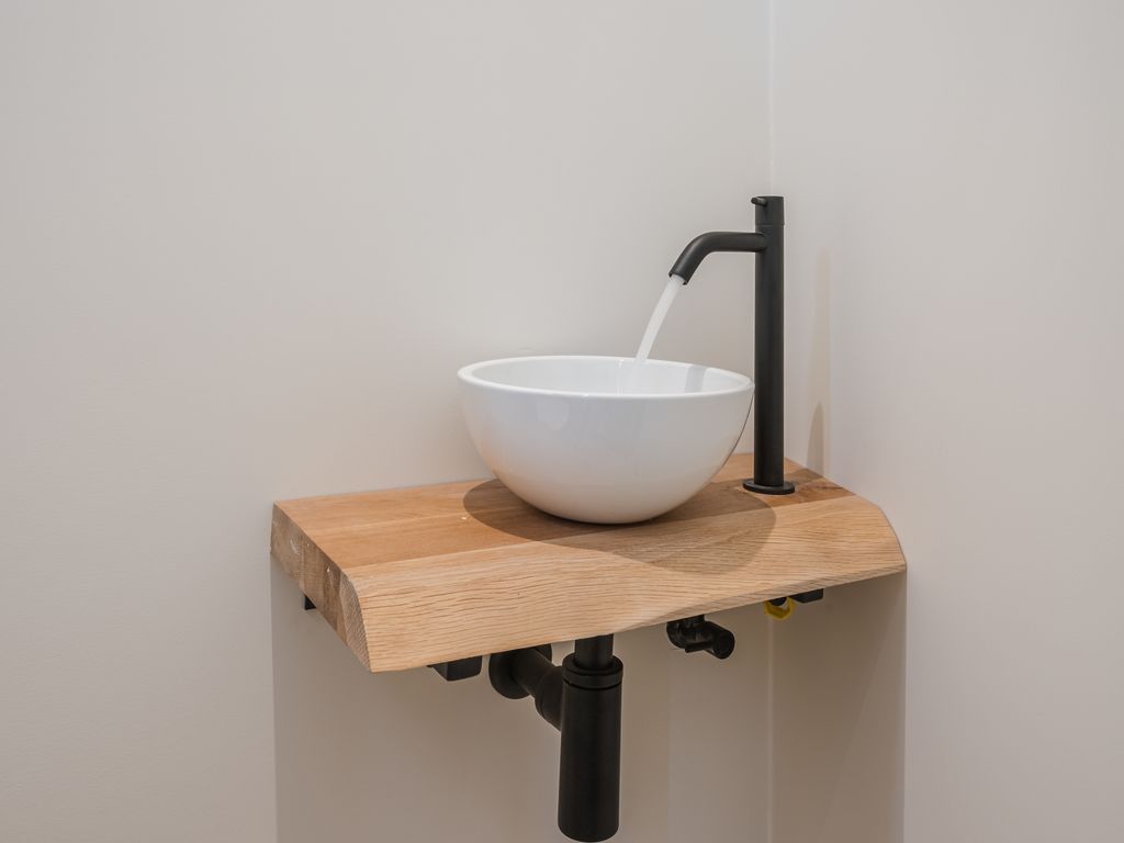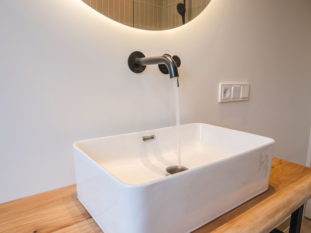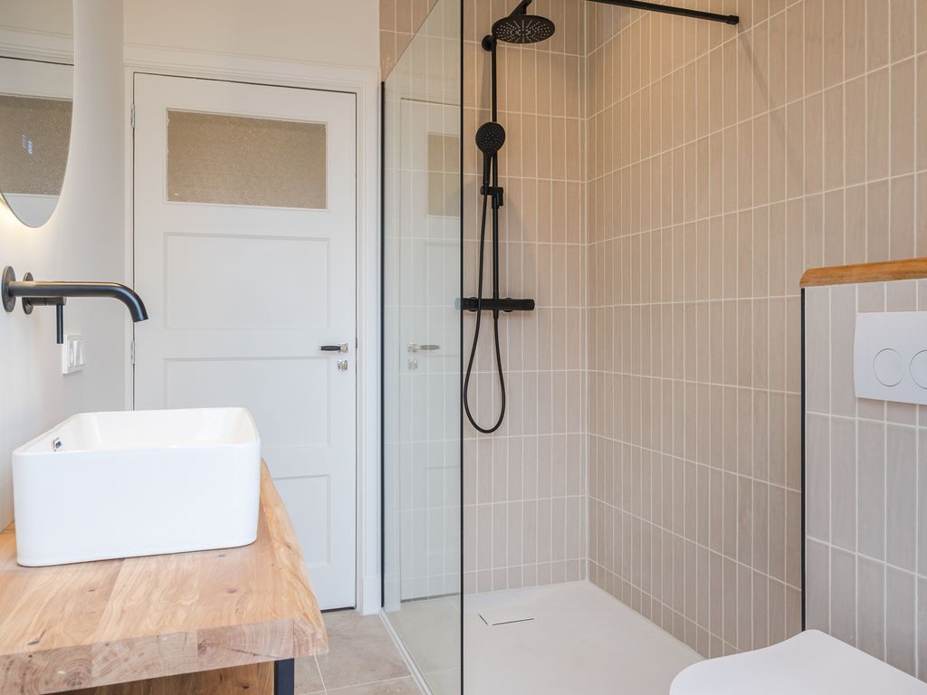De badkamer is luxe uitgevoerd en voorzien van een inloopdouche met thermostaatkraan, regendouche en handdouche, een wandcloset, eikenhouten panelen met wastafel, een zwarte inbouwkraan, een ronde verwarmde spiegel met verlichting, een handdoekradiator en een strak gestukt plafond met led-inbouwverlichting en afzuiging.
