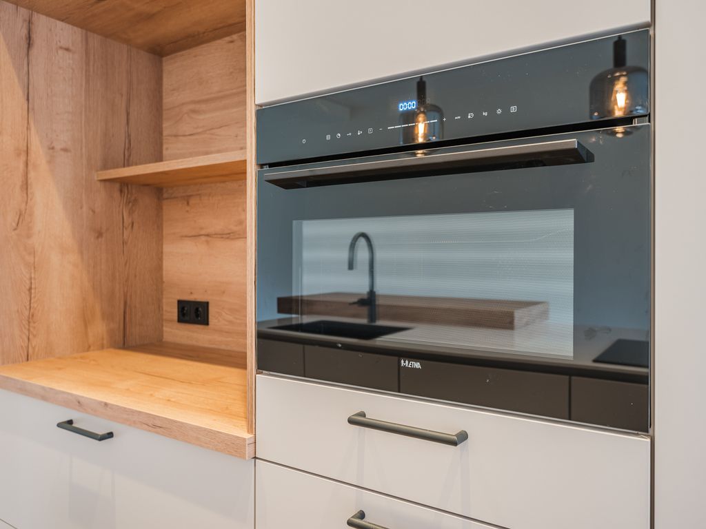 De kamerhoge kastenwand met koffiebar, ingebouwde koelkast, 3-vaks vriezer en combi-oven maakt het geheel compleet.