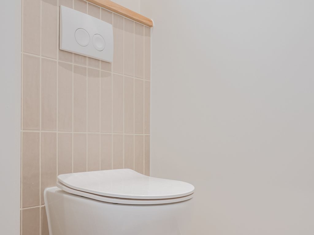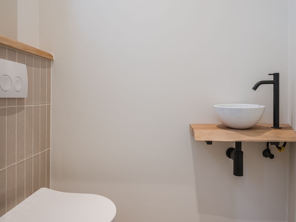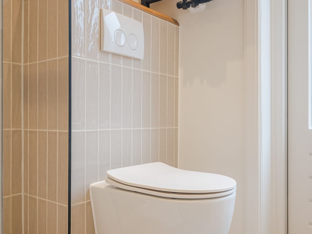 De hal geeft toegang tot het ruime toilet met wandcloset en fonteintje en tot de vaste trap naar de verdiepingen. Vanuit de hal zijn zowel de zitkamer als de keuken bereikbaar.