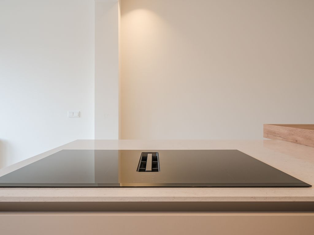 De luxe keuken is uitgevoerd met een kookeiland met onderbouwkasten aan weerszijden en een eetbar, een Siemens inductiekookplaat met geïntegreerde afzuiging, een matzwarte spoelbak en een ingebouwde vaatwasser.