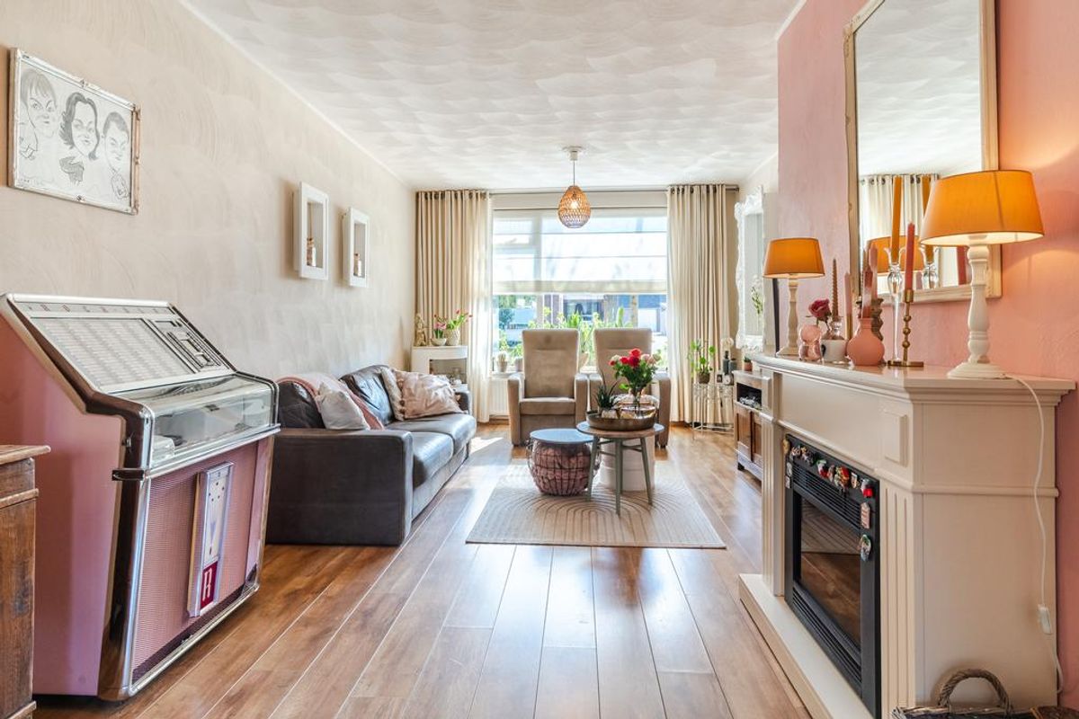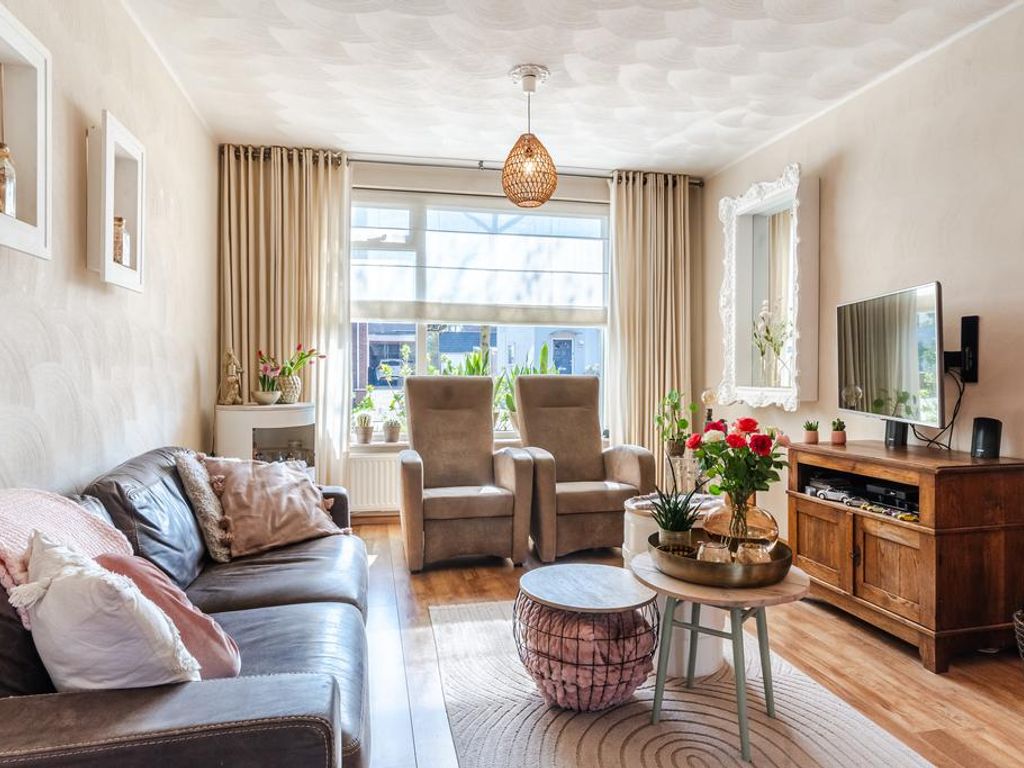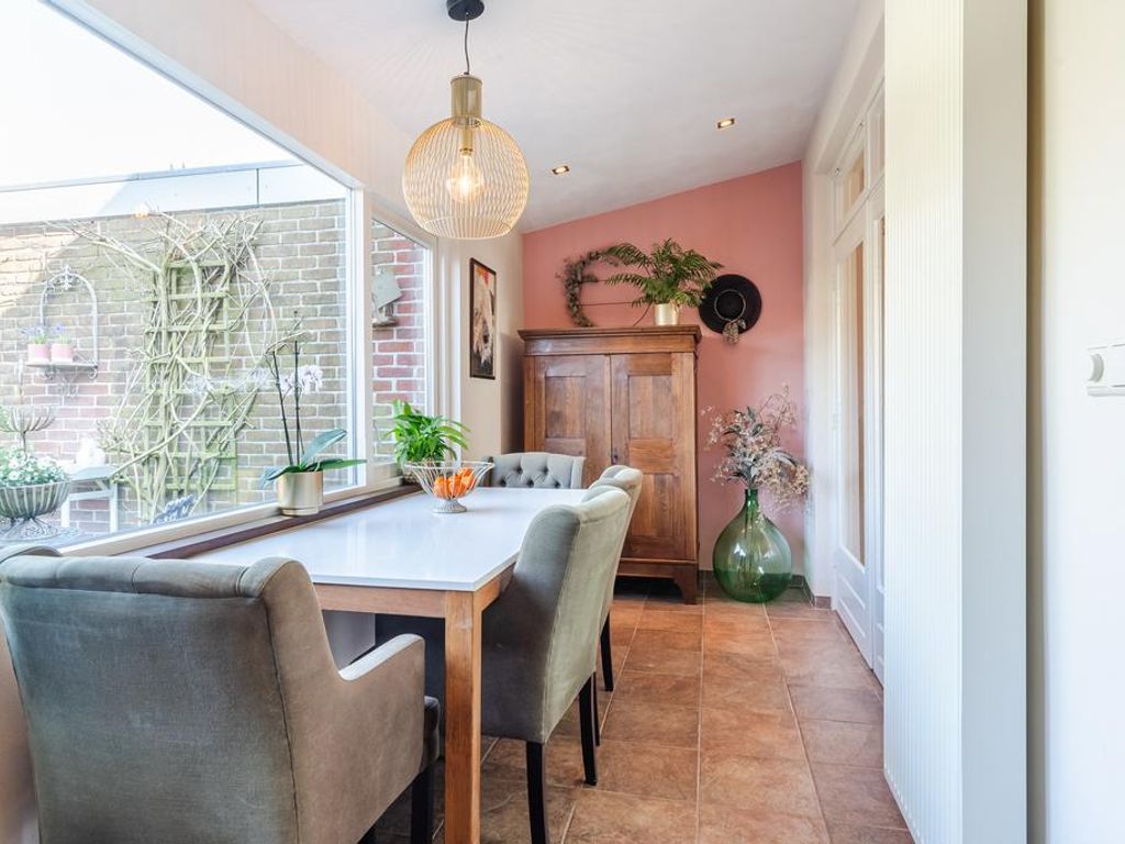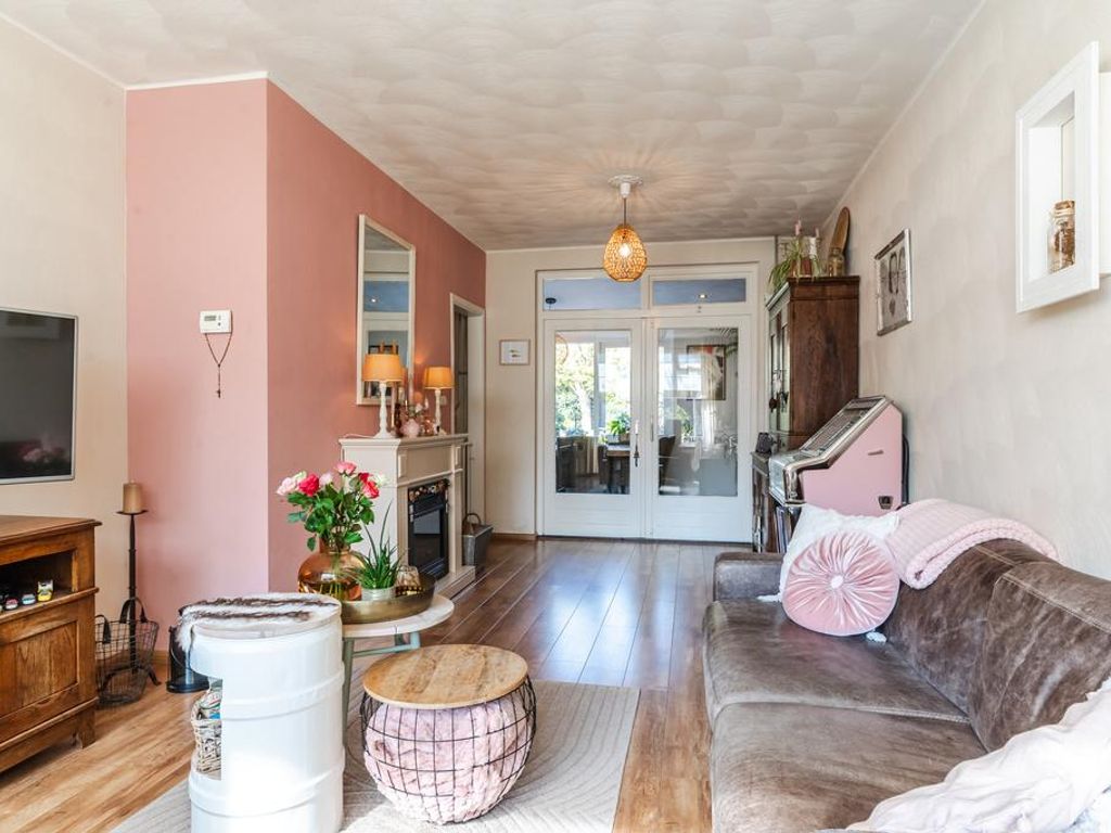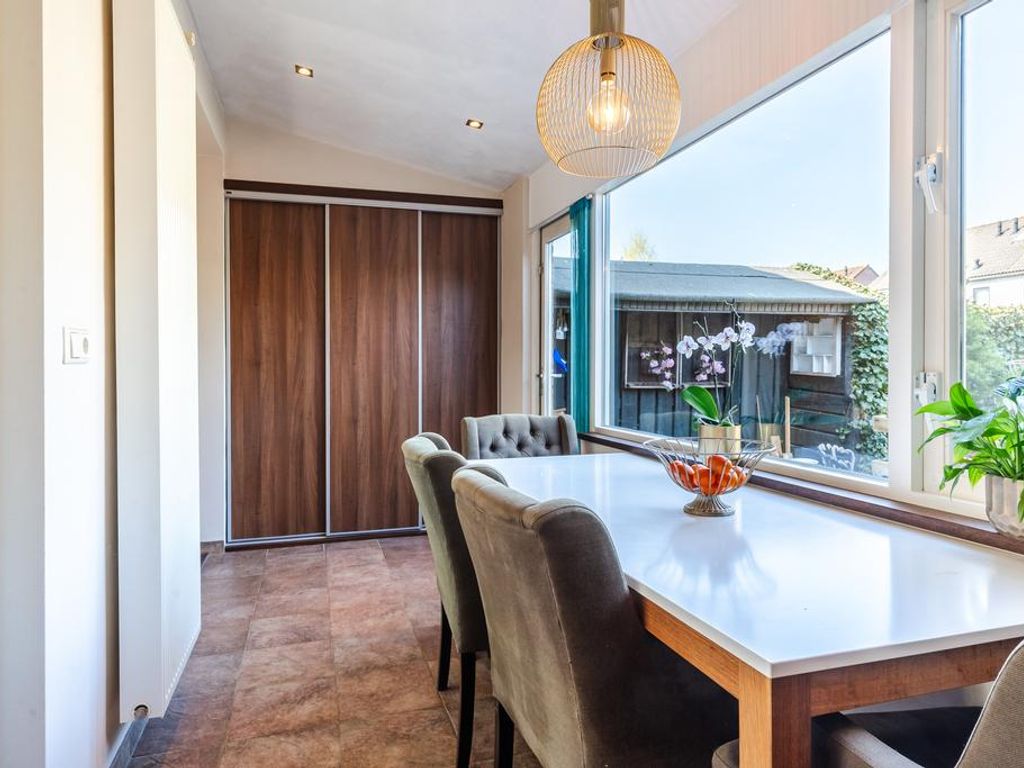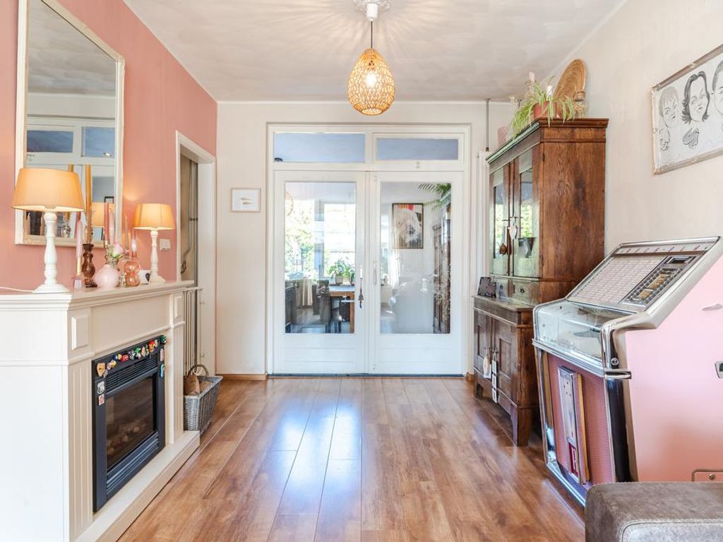 De woonkamer heeft een oppervlakte van circa 21 m² en beschikt over openslaande tuindeuren naar de uitbouw aan de achterzijde van de woning. Deze uitbouw wordt momenteel gebruikt als eetkamer, maar zou ook als bijvoorbeeld een thuiswerkplek kunnen fungeren.