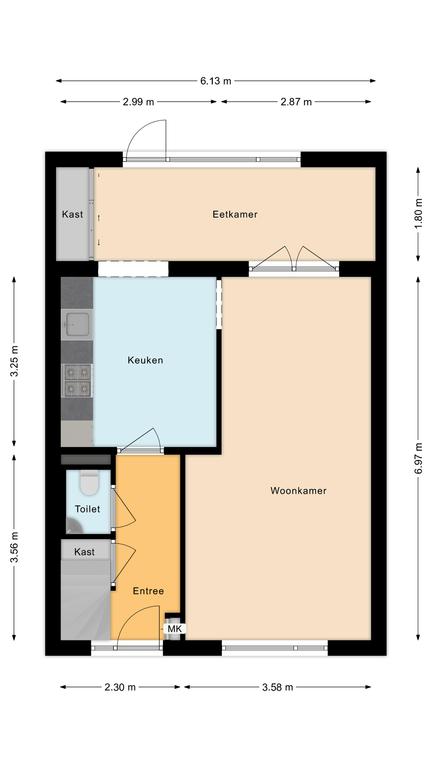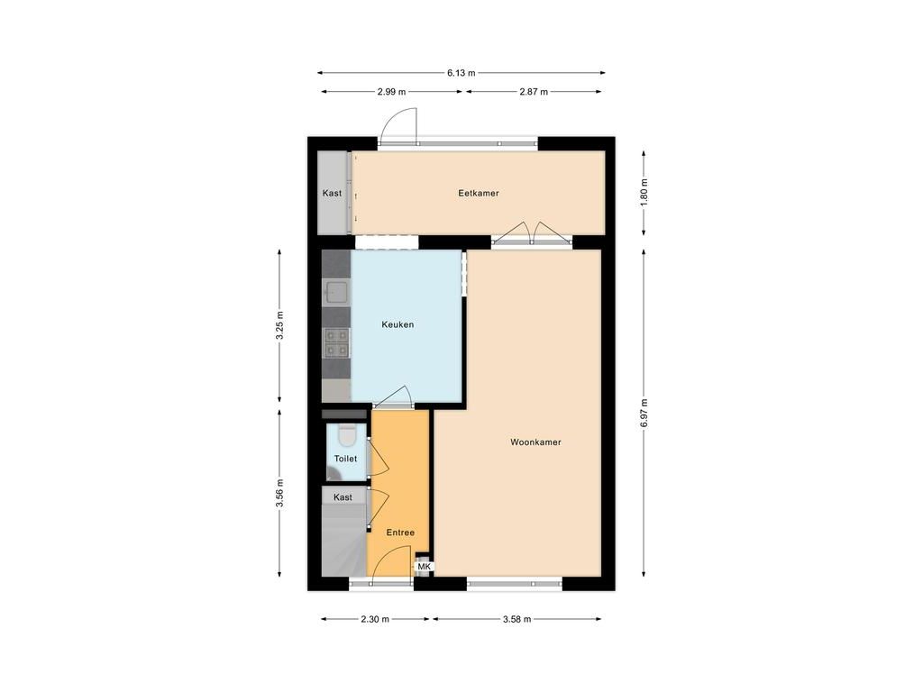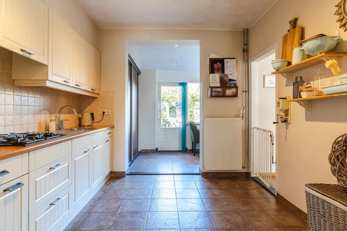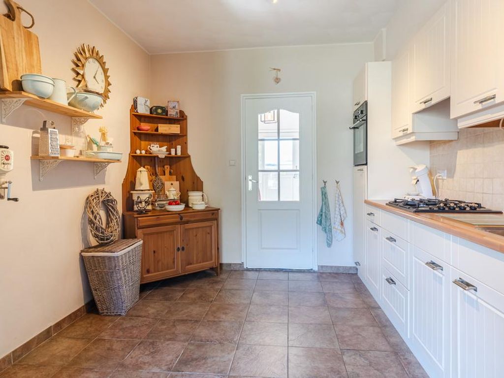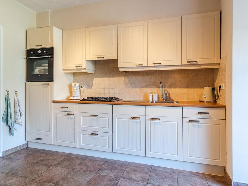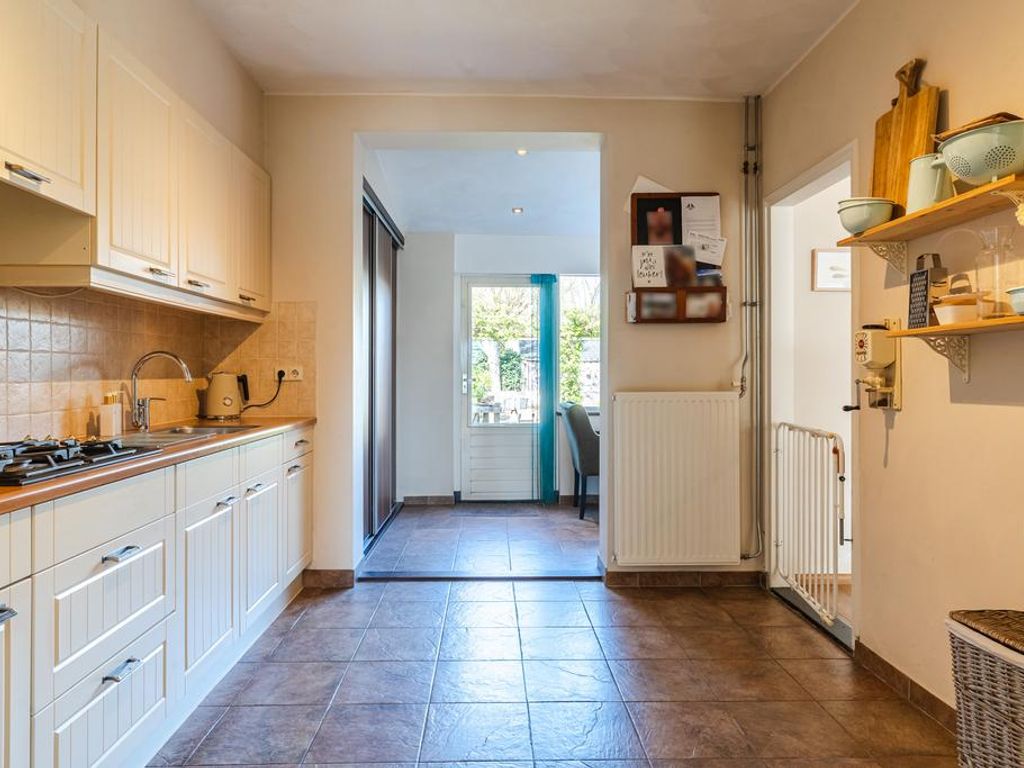 De gesloten keuken is bereikbaar vanuit de hal en ingericht met een inbouwkeuken voorzien van een 4-pits gaskookplaat, afzuigkap, oven en koelkast. Vanuit de keuken is zowel de woonkamer als de uitbouw toegankelijk.