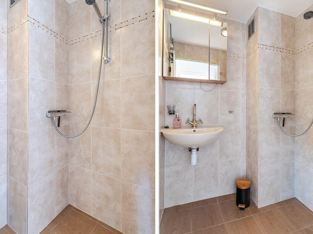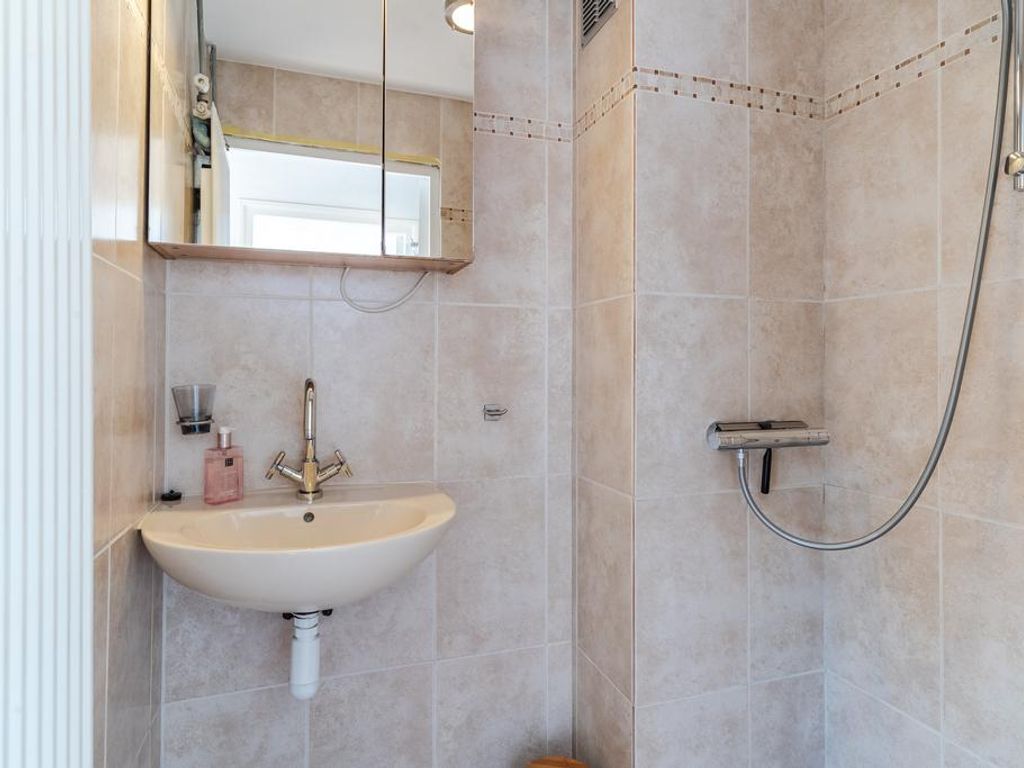 Ruime overloop met daglichttoetreding via een raam in de voorgevel. De badkamer is compact en voorzien van een inloopdouche en een wastafel.