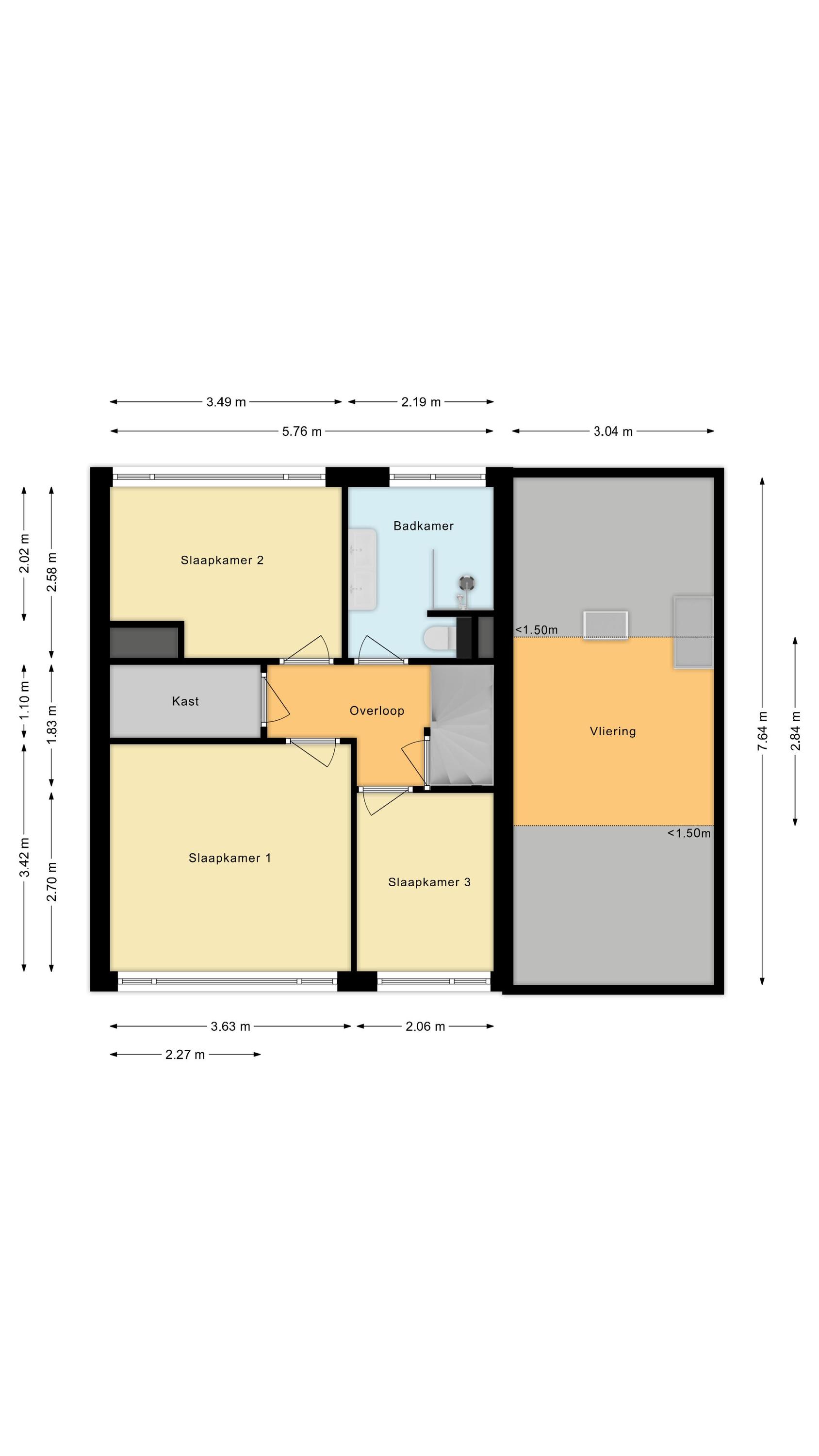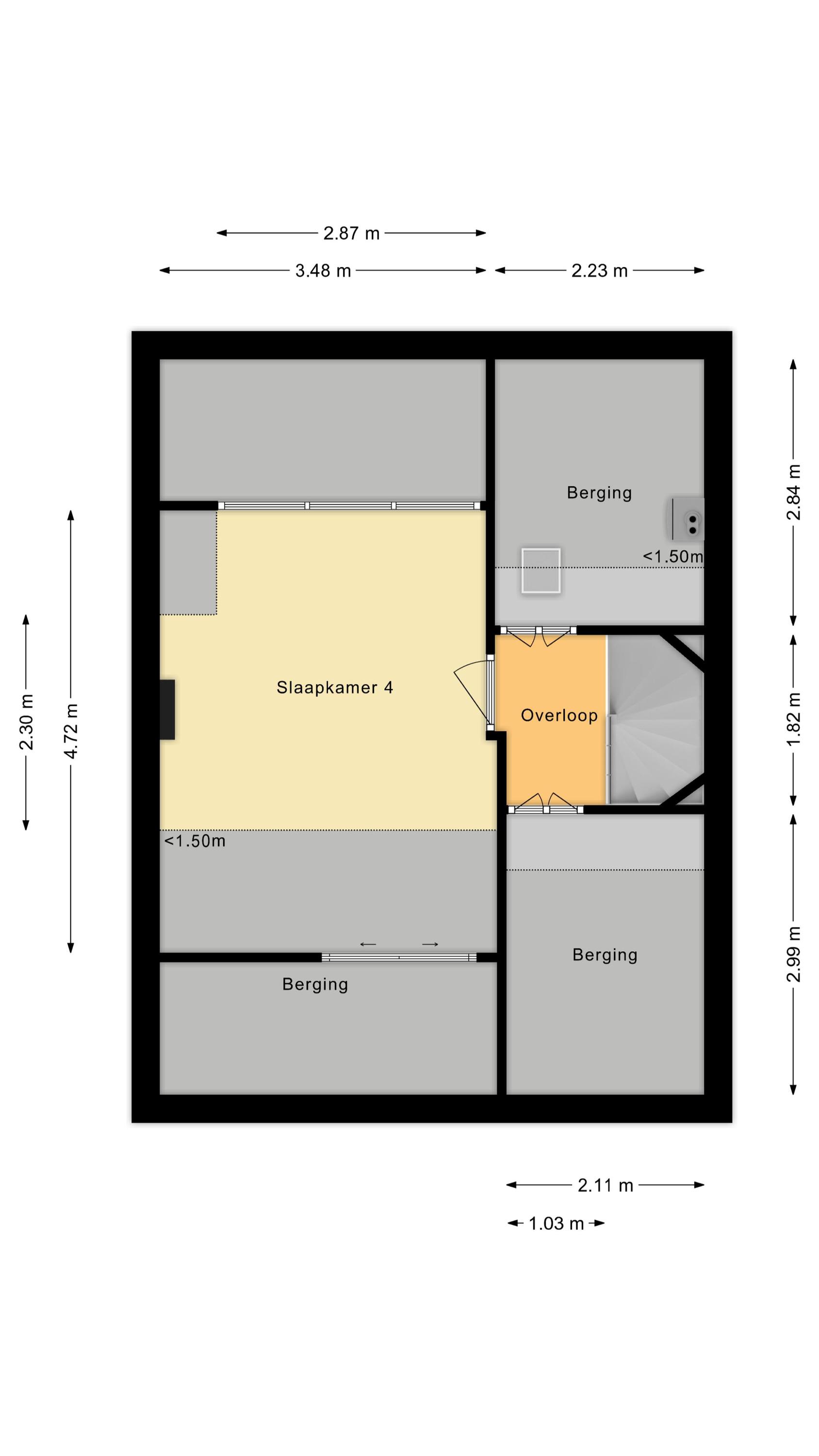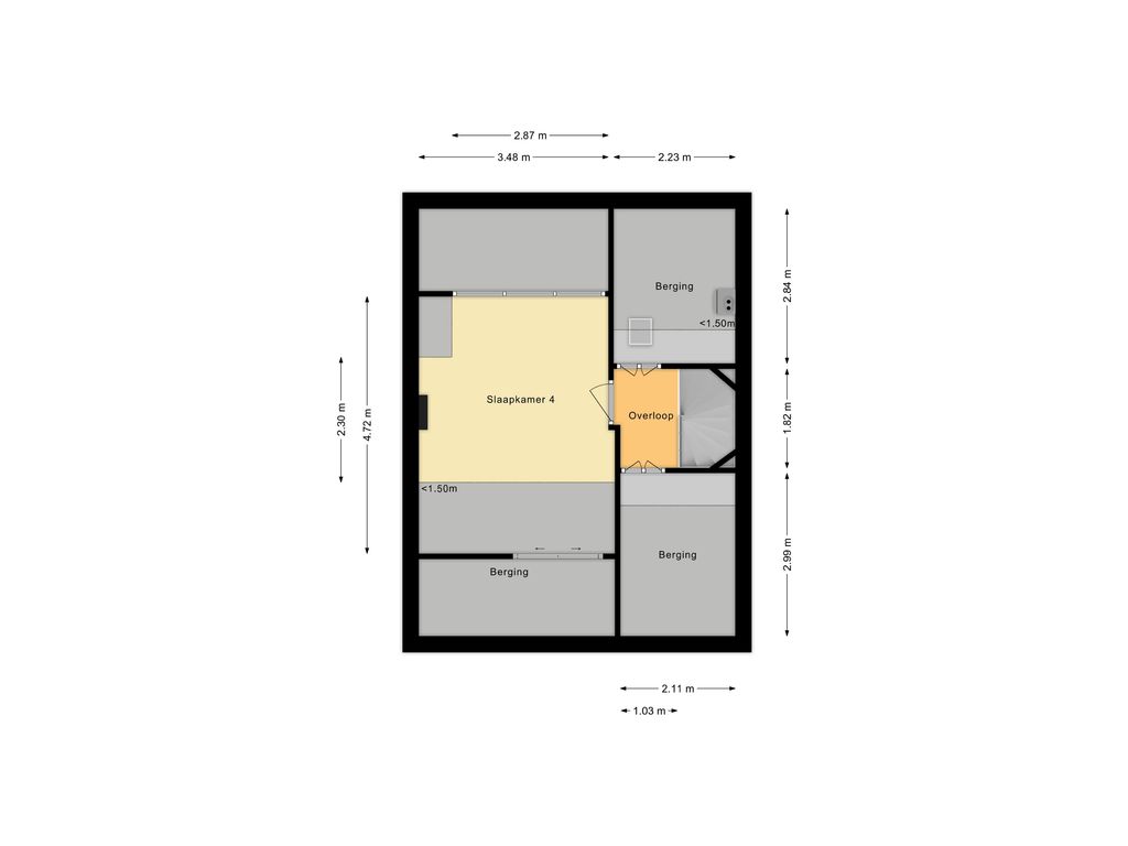 Via een afsluitbare deur is de tweede verdieping bereikbaar. Hier bevinden zich een overloop, een bergkamer en de cv-ruimte.