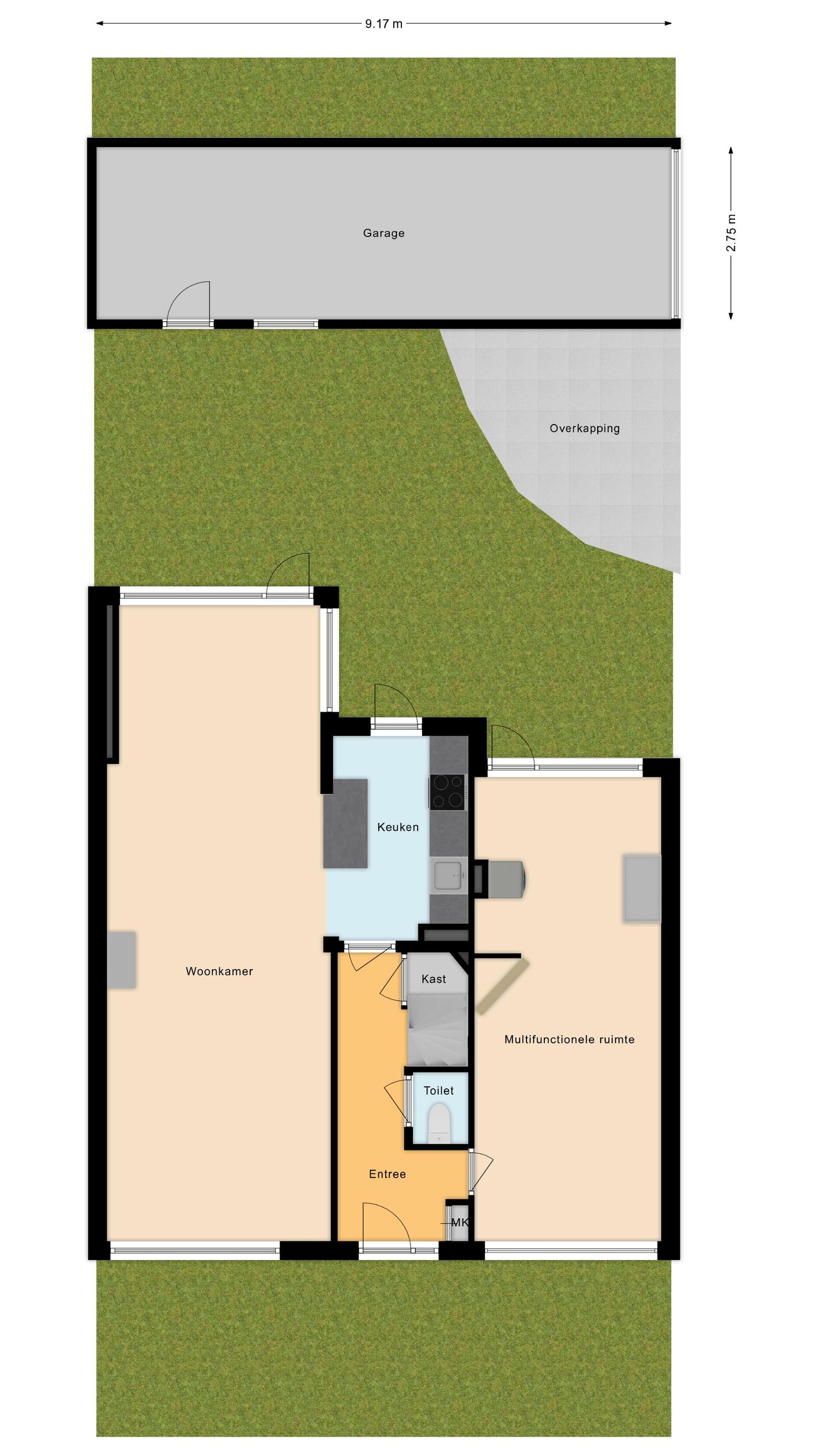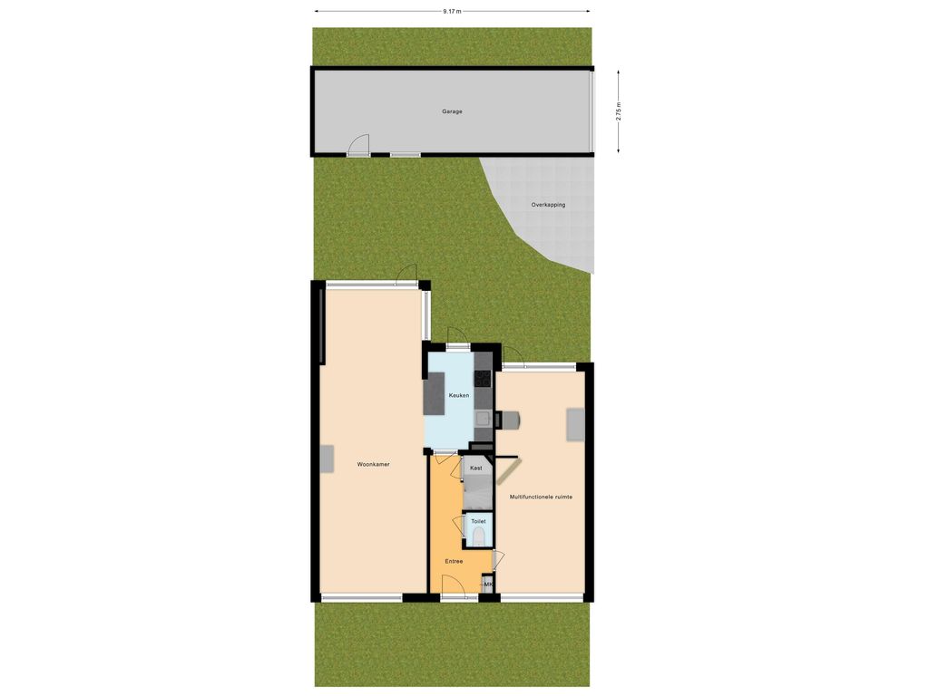 Achter op het perceel bevindt zich de verlengde garage van circa 2,70 x 9,20 meter, geschikt voor parkeren, opslag of hobbygebruik.