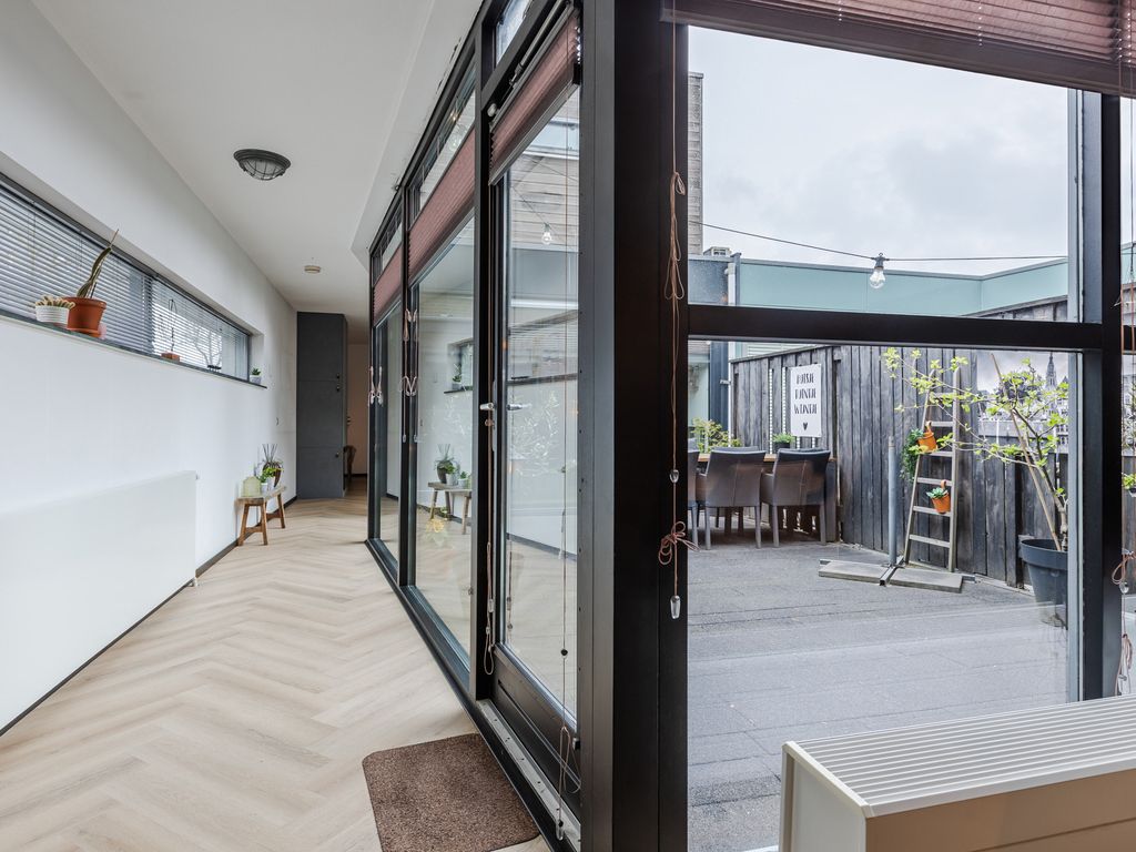 De corridor verbindt de keuken met de woonkamer en biedt zicht op de binnentuin, welke volledig is omgeven door glas en daarmee een centrale en sfeervolle plek in de woning vormt.