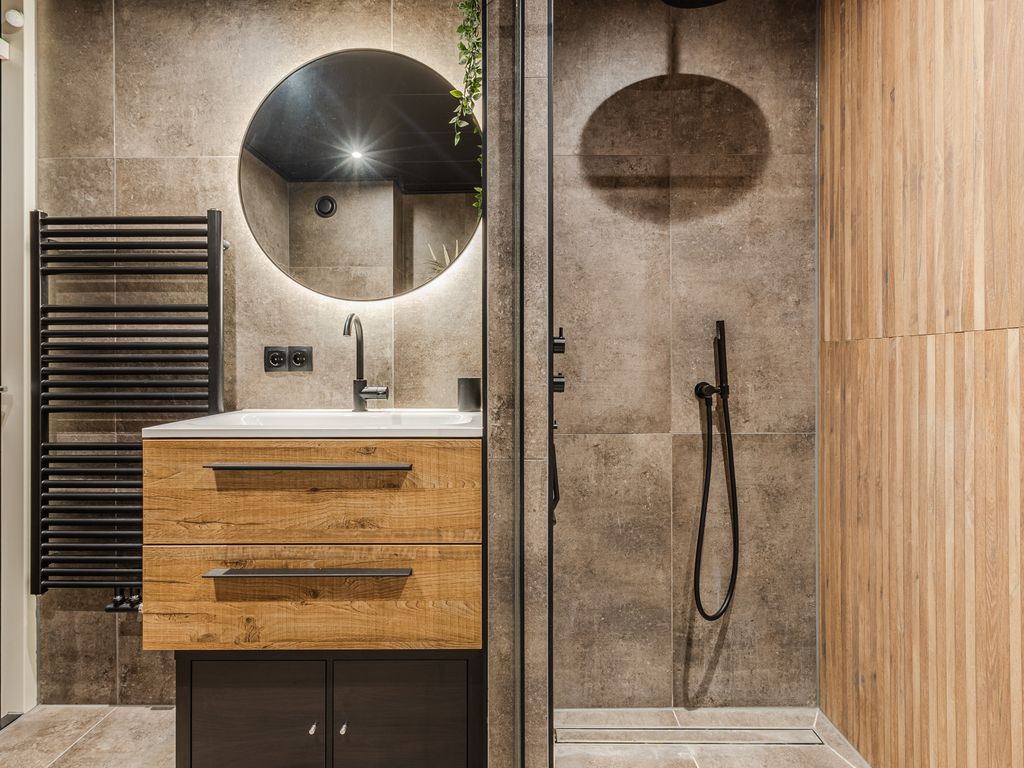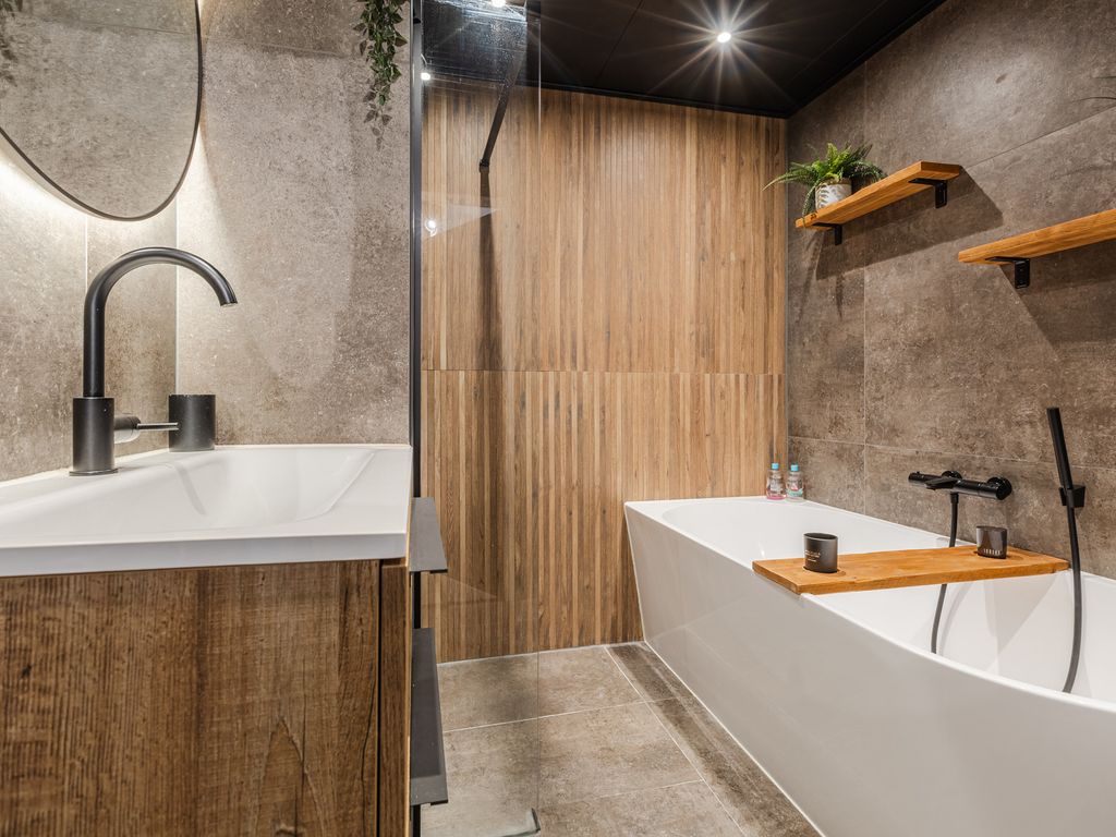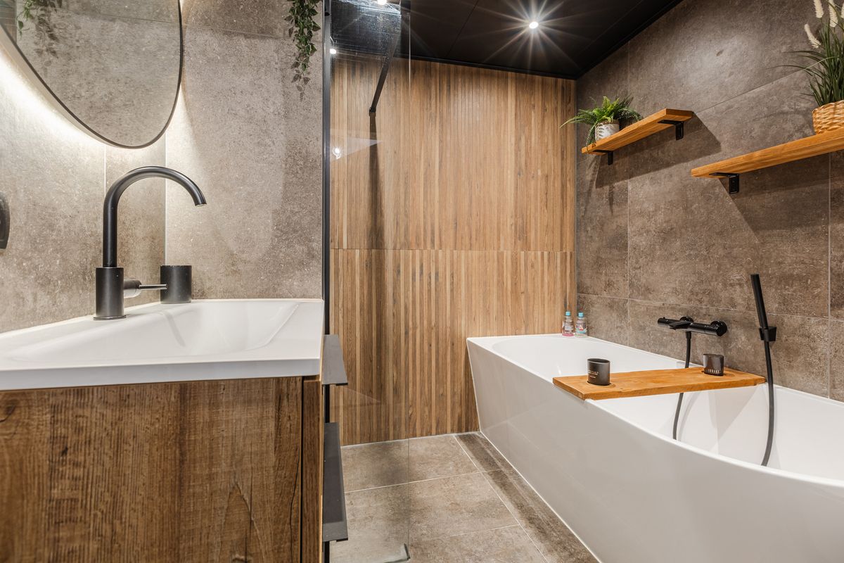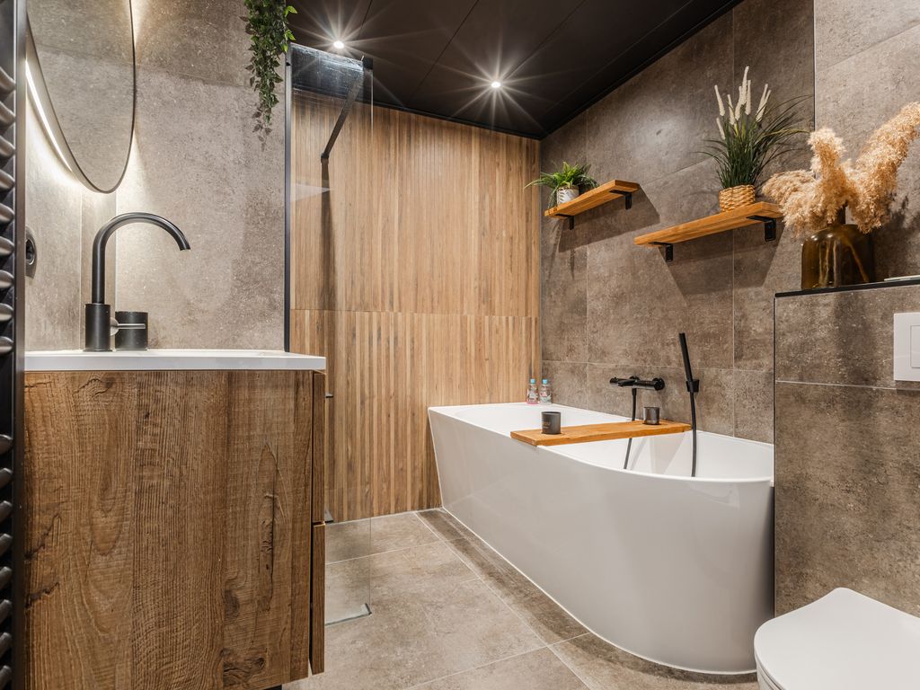 De badkamer is eind 2023 volledig vernieuwd en uitgevoerd met een design ligbad, inloopdouche, wandcloset en wastafelmeubel met verlichte spiegel. De zwarte kranen en designradiator geven het geheel een eigentijdse uitstraling.