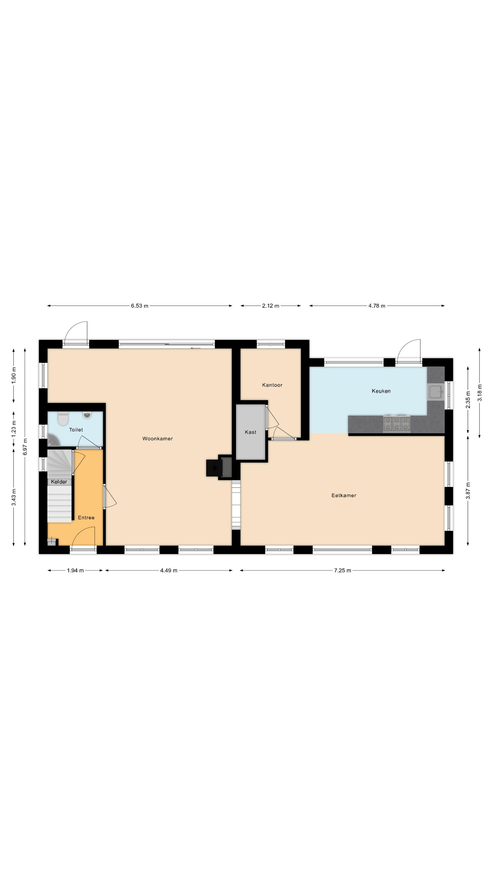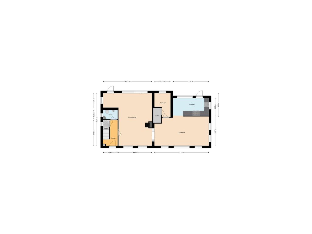 Aangrenzend aan de eetkamer vind je een extra ruimte – voormalige werkkamer – die nu dienstdoet als opslag, met tevens een grote voorraadkast. Zowel de keuken als de eetkamer geven toegang tot buiten.