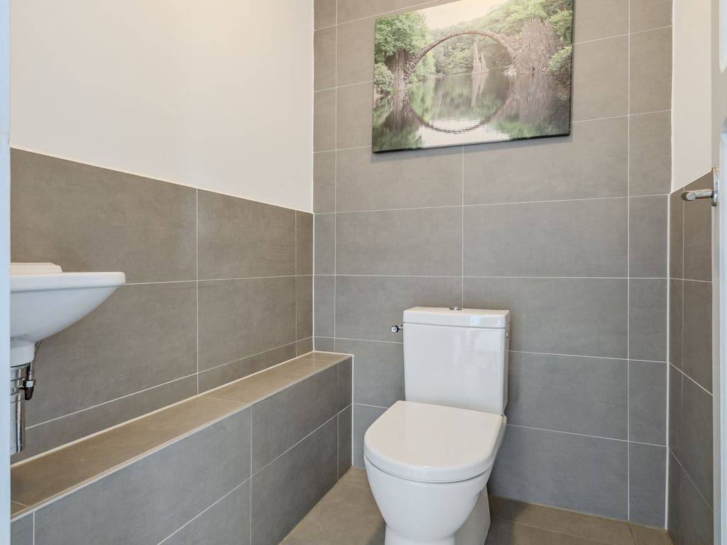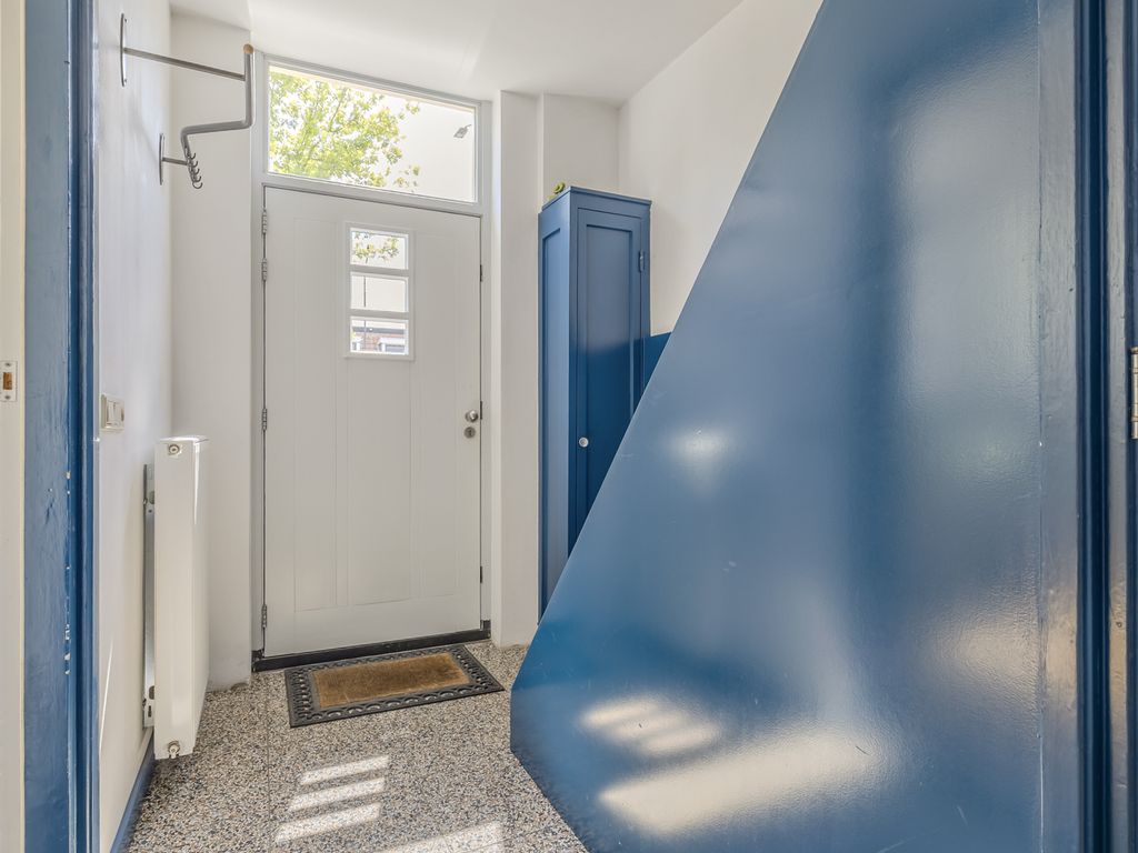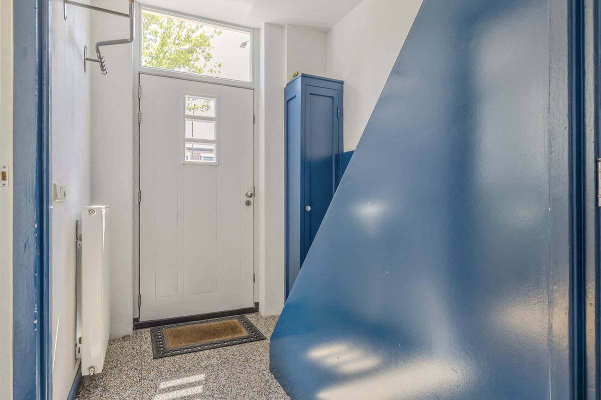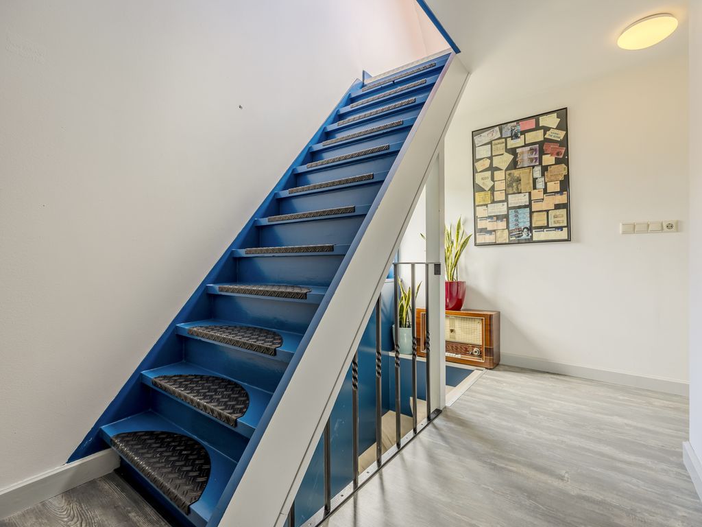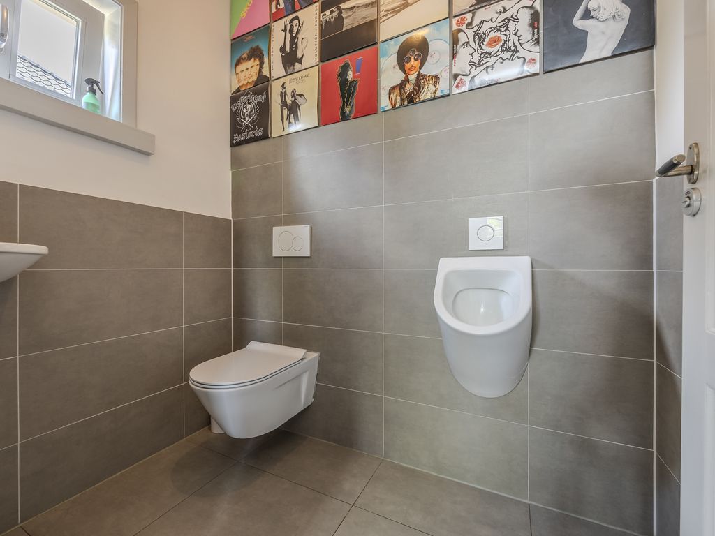 Je komt binnen in een ruime ontvangsthal met trapopgang, toegang tot de kelder (stahoogte) en een ruim toilet voorzien van wandcloset, fonteintje én – jazeker – een urinoir.
