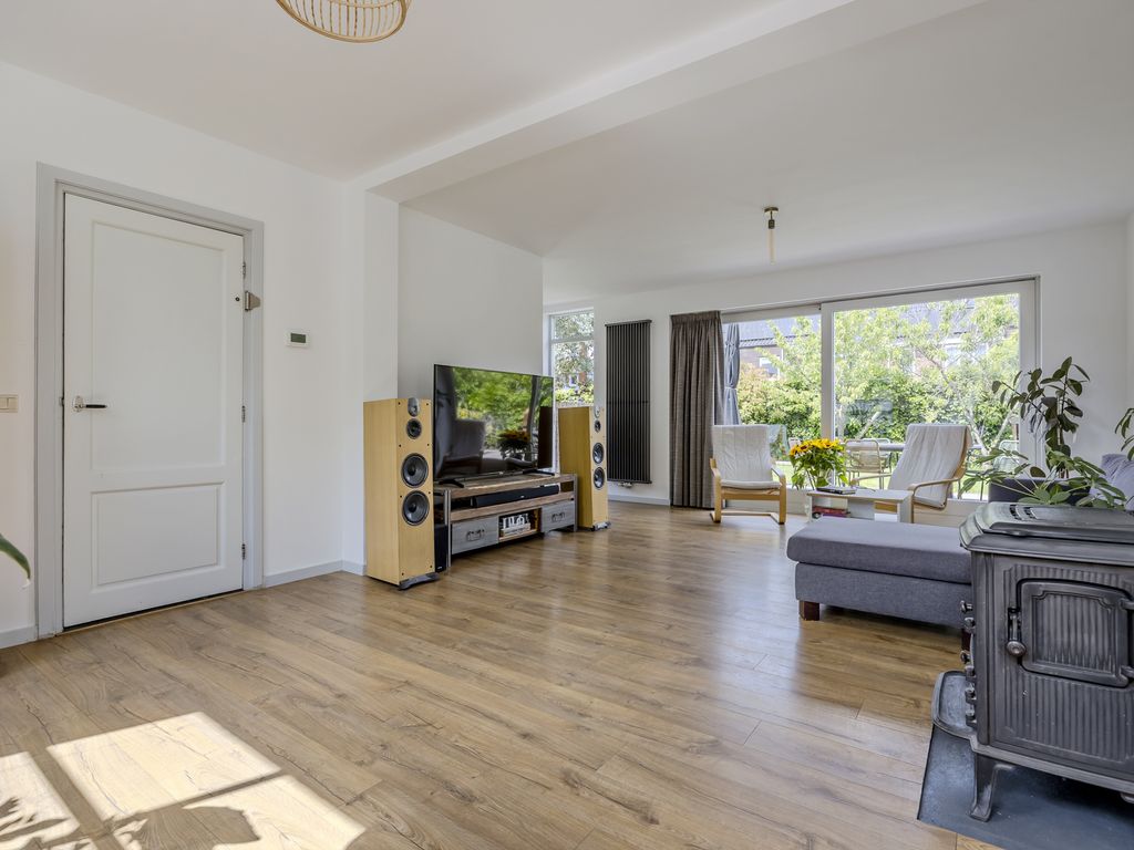 De sfeervolle woonkamer van ca. 31 m² is heerlijk licht dankzij de grote raampartijen en schuifpui naar de tuin.