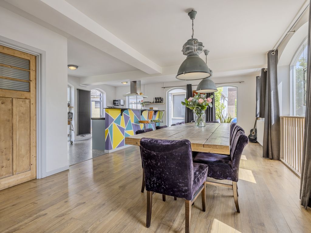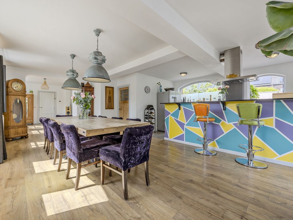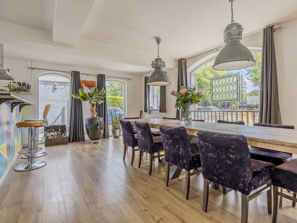 De eetkamer vormt samen met de zitkamer één grote leefruimte van ruim 60 m². Deze ruimte bevindt zich in het voormalige stalgedeelte en valt op door de mooie lichtinval en authentieke raampartijen.