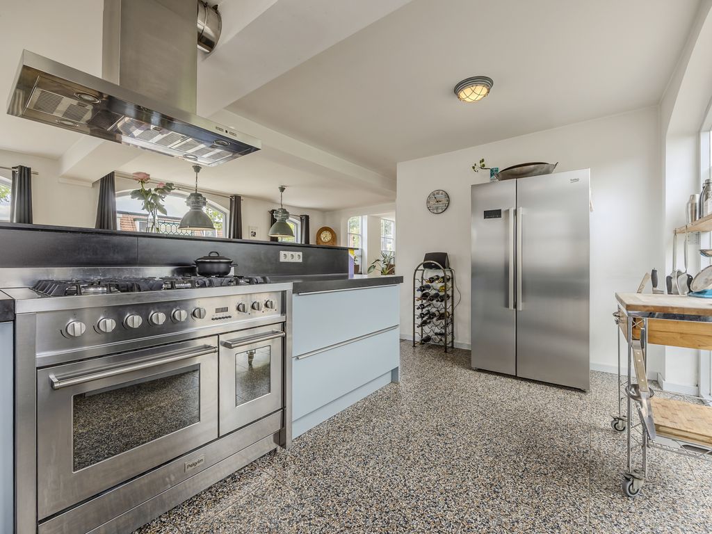 De open keuken (ca. 2,63 x 4,79 m) staat in directe verbinding met de eetkamer en is voorzien van veel werkruimte, een 6-pits gasfornuis met dubbele oven, afzuigkap, rvs vaatwasser en praktische carrouselkast met uittrekbare lagen.