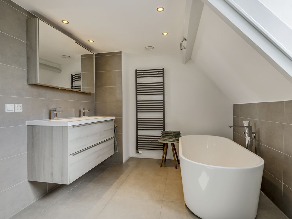 Aan de voorzijde bevindt zich een luxe badkamer met dakkapel, inloopdouche, vrijstaand ligbad, dubbele wastafel, vloerverwarming en regelbare mechanische ventilatie. Daarnaast een speelse slaapkamer met dakkapel, inloopkast, wastafel én een entresol die fungeert als slaapvide. Vanaf hier is tevens een bergzolder met dakraam bereikbaar.